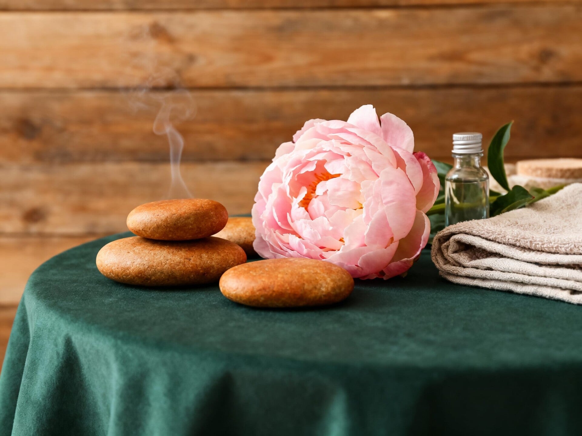 De masseur verwarmt gladde basaltstenen (een vulkanisch gesteente) in water tot een temperatuur van ongeveer 45°C.