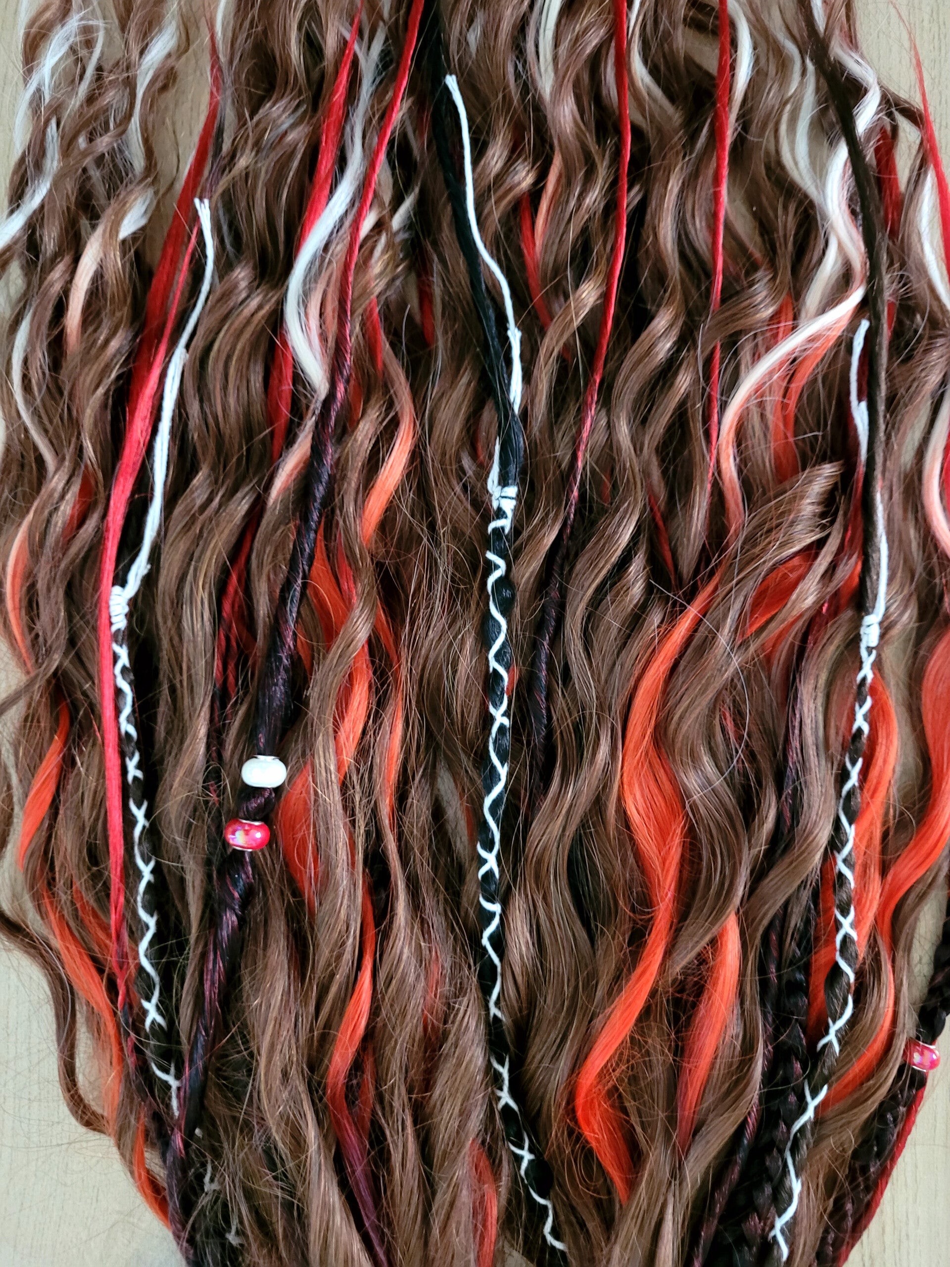 Een heerlijke vlammende krullenset met 45 krul en 15 dreads. Met deze set ben je het punt van de belangstelling!! De set bestaat uit 60DE dreads en is herbruikbaar bij goed onderhoud.